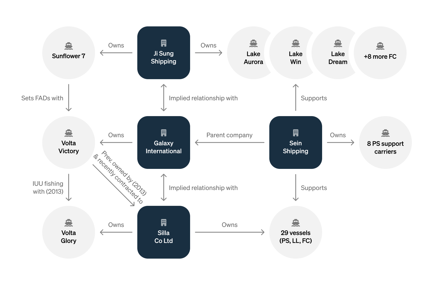 Identified relationships between 4 major companies operating South Korean (including those flagged to other countries such as Panama and Kiribati) fish carriers, purse seine support carriers, purse seine fishing vessels, and other fishing vessels.