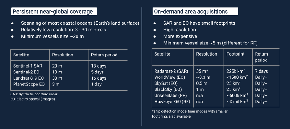 Information on a selection of satellites with optical imagers suitable for monitoring maritime domains (to decrease footprint size). Thanks@Moritz Lehmann