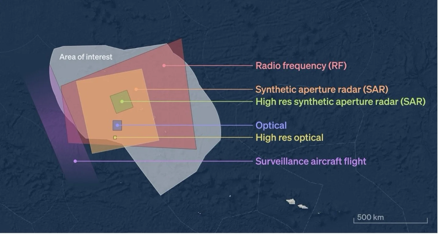 Most satellites used for vessel detection orbit our planet at altitudes between 300 and 1,000 km (low-Earth orbit) and scan Earth’s surface daily using various sensors. This coverage enables satellites to support comprehensive monitoring of significant ocean areas during operations, allowing patrol assets to investigate dark targets and providing enhanced MDA over extended periods.